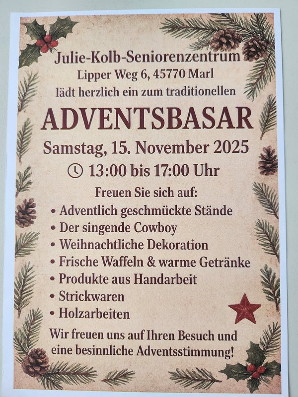 Auch dieses Jahr möchte das Julie-Kolb- Seniorenzentrum, Lipper Weg 6, 45770 Marl, Sie herzlich zum traditionellen Adventsbasar am Samstag, 15. November ab 13 bis 17 Uhr einladen. In gewohnter gemütlicher Atmosphäre kommt bei weihnachtlich dekorierten Ständen die erste Adventsstimmung auf. Es erwarten Sie zahlreiche Produkte aus liebevoll gefertigter Handarbeit verschiedenster Materialien, u.a. Holzarbeiten, Häkelsachen, Bastelarbeiten aus Filz, Papierdekoration, Gestecke, Liköre aus eigener Herstellung und vieles mehr.