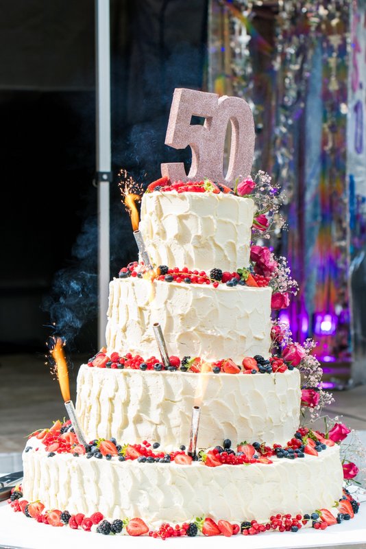 Und dann – der große Moment: Unsere vierstöckige Jubiläumstorte, liebevoll selbstgemacht, ein wahres Meisterwerk unserer Küche und viel zu schön, um sie anzuschneiden (aber noch schöner, sie zu probieren!).