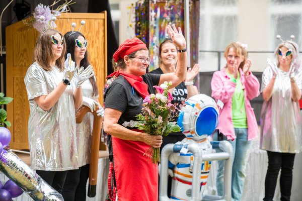 Eine selbstgebaute „Zeitmaschine“ lud zum Staunen ein und machte die Reise durch fünf Jahrzehnte Seniorenzentrum lebendig. Die Mitarbeiter*innen kamen in originellen Kostümen – von Hippies der 70er über bunte 80er-Outfits bis hin zu Styles der 90er und der 2000er.